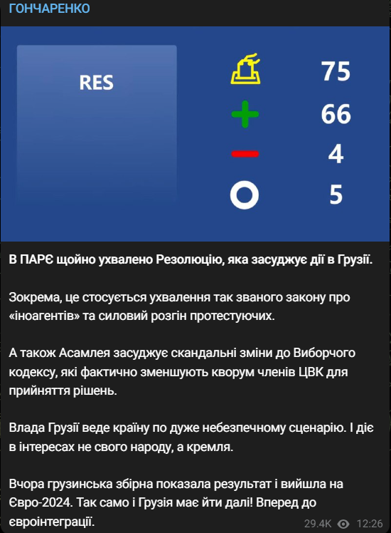 Одновременно с этим Парламентская ассамблея Совета Европы (ПАСЕ) приняла резолюцию, осуждающую действия властей Грузии, в частности, принятие закона об "иноагентах" и силовой разгон протестующих.