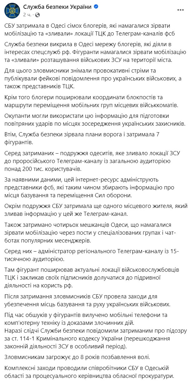"Для этого злоумышленники снимали провокационные стримы и публиковали фейковые сообщения об украинских военных, а также представителях ТЦК. Кроме того блогеры распространяли координаты блокпостов и маршруты перемещения мобильных групп местных военкоматов", - сообщает СБУ.