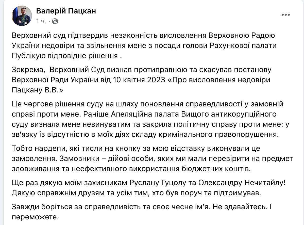 Валерий Пацкан заявляет, что Верховный суд признал незаконным его отставку с должности главы Счетной палаты. Суд отменил постановление Верховной Рады от 10 апреля 2023 года.