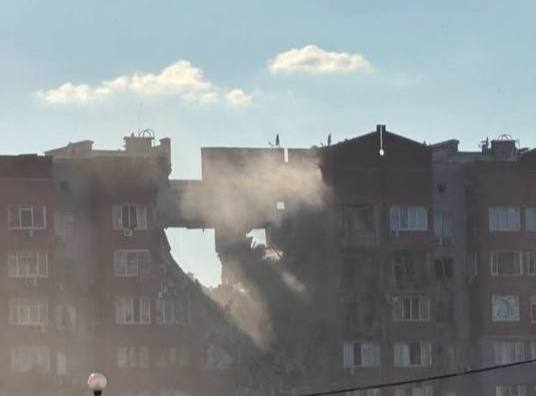 В многоэтажке разрушены четыре этажа. Там в квартирах, вероятно, заблокированы люди.