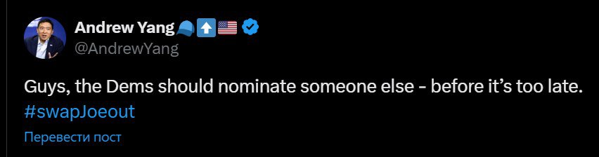 В Х тем временем появился хэштег #swapJoeout ("поменять Джо"). Его добавил демократ Эндрю Янг, который был кандидатом в президенты на выборах 2020 года "Ребята, демократам следует выдвинуть кого-то другого - пока не стало слишком поздно", - написал Янг.