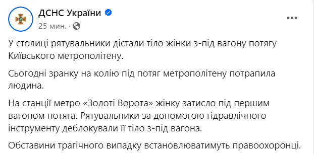 "В столице спасатели достали тело женщины из-под вагона поезда Киевского метрополитена.