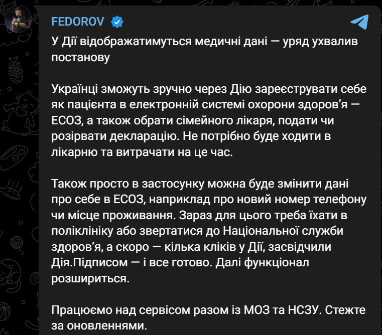 "В "Дие" будут отображаться медицинские данные — правительство приняло постановление", - написал министр.