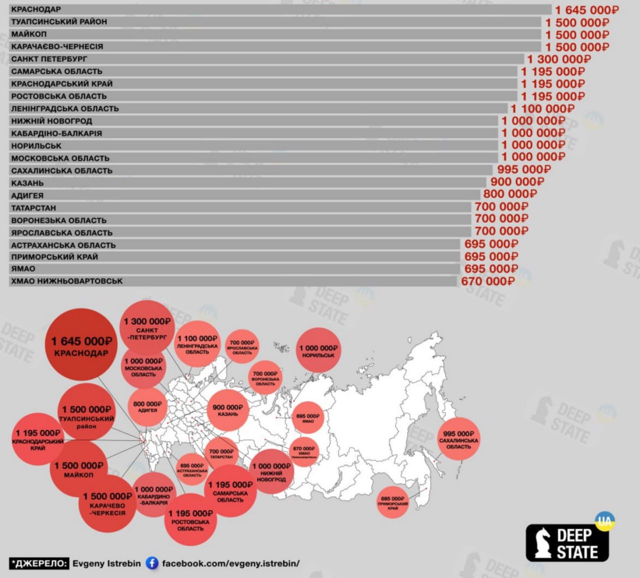 Такие цифры приводит украинский блогер Евгений Истребин, который исследует динамику этих выплат в разных регионах РФ.