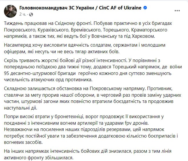 Об этом заявил главком ВСУ Александр Сырский по итогам поездки на Восточный фронт.