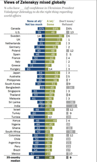 Опрос проводился в 35 государствах, и в 20-ти из них Зеленскому не доверяют больше, чем доверяют.
