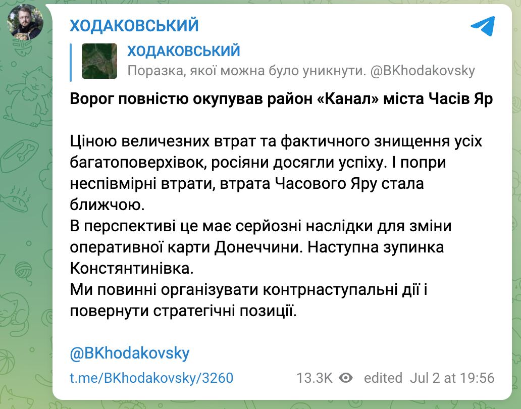 "Враг полностью оккупировал район Канал города Часов Яр. Ценой огромных потерь и фактического уничтожения всех многоэтажек россияне преуспели. И, несмотря на несоизмеримые потери, потеря Часова Яра стала ближе. В перспективе это имеет серьезные последствия для изменения оперативной карты Донбасса. Следующая остановка - Константиновка", - пишет Ходаковский.