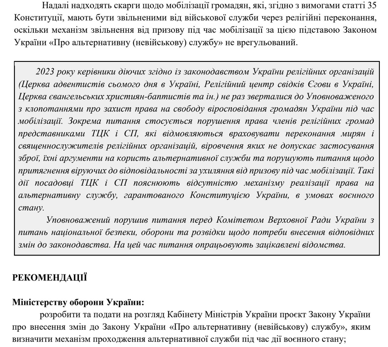 "Вопрос касается нарушения права членов религиозных общин представителями ТЦК и СП, которые отказываются учитывать убеждения мирян и священнослужителей религиозных организаций, чье вероучение не допускает применения оружия, их аргументы в пользу альтернативной службы и поднимают вопрос о привлечении верующих к ответственности за уклонение от призыва во время мобилизации", - написал Лубинец.