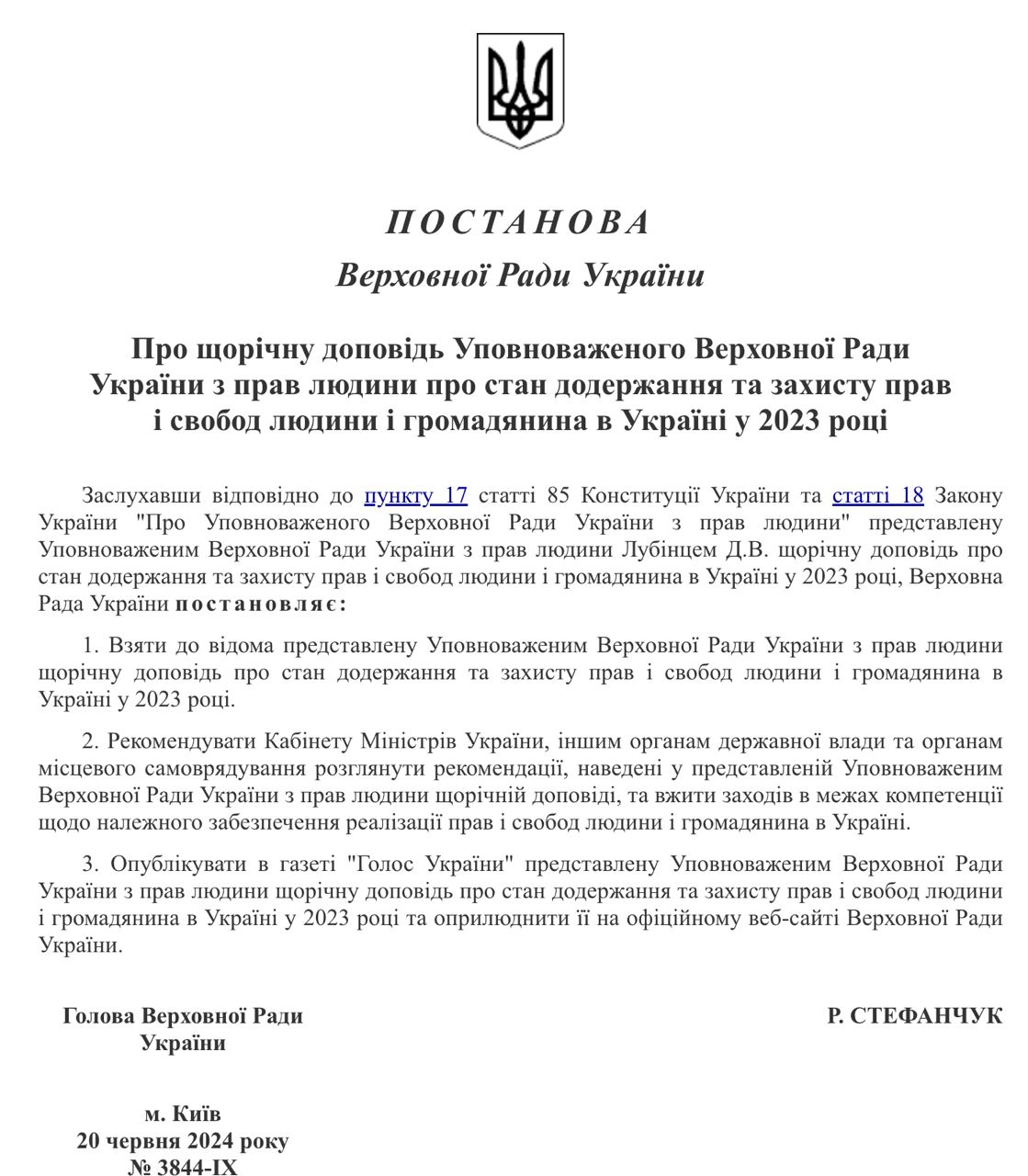 Парламент своим постановлением решил принять к сведению рекомендации омбудсмена и поручил Кабмину проработать их.