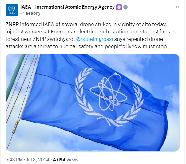 "ЗАЭС проинформировала МАГАТЭ о нескольких ударах БПЛА недалеко от станции сегодня, которые привели к пострадавшим среди рабочих на подстанции в Энергодаре, а также к пожару в лесу рядом с распределительной станцией ЗАЭС. Рафаэль Гросси заявил, что повторяющиеся атаки БПЛА представляют угрозу для ядерной безопасности и жизни людей, их надо прекратить", - говорится в публикации агентства.