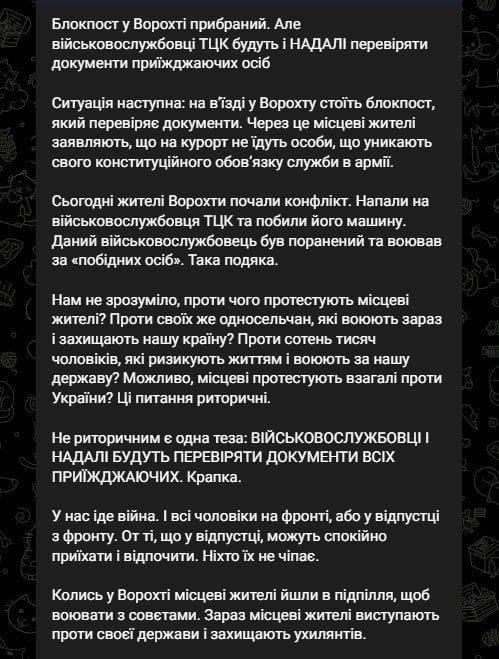 18:35 В оперативном командовании "Запад" сообщили, что блокпост ТЦК в Ворохте убран, но военкомы будут и дальше проверять документы приезжающих. Также в публикации говорится, что местные жители напали на представителя ТЦК и побили машину.