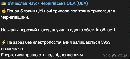 08:49 В Черниговской области "Шахед" попал в один из объектов, сообщили власти региона.