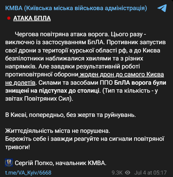 "Противник запустил свои дроны с территории Курской области России, а к Киеву беспилотники приближались волнами и по разным направлениям", - написал Попко.