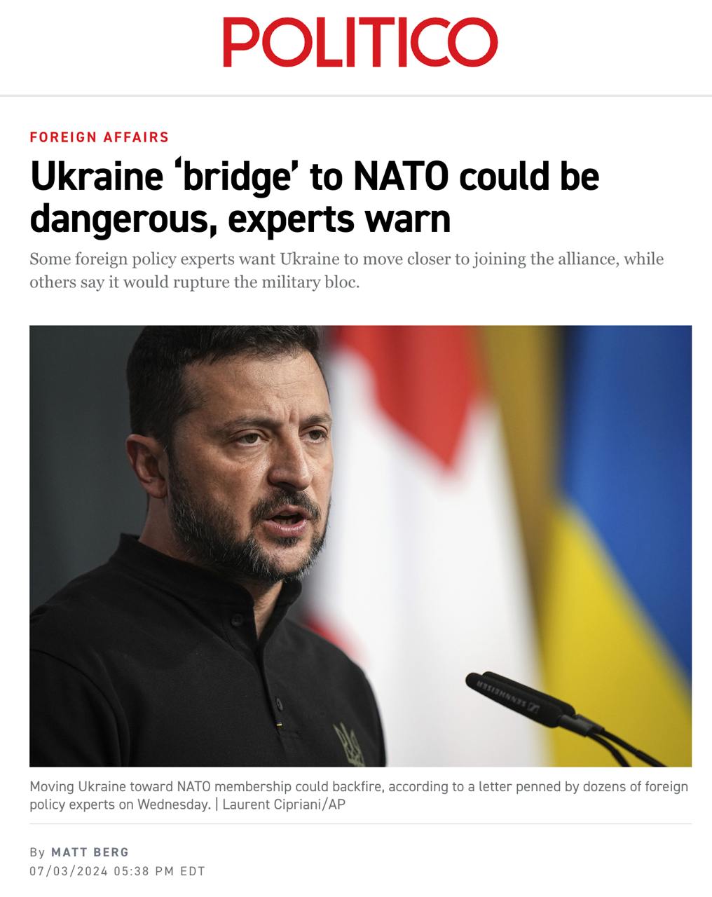 Более 60 западных экспертов по внешней политике призвали страны НАТО не обещать Украине членство на грядущем саммите, чтобы не пришлось ее в будущем защищать от РФ по пятой статье.