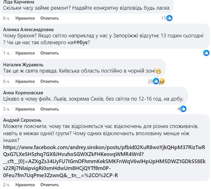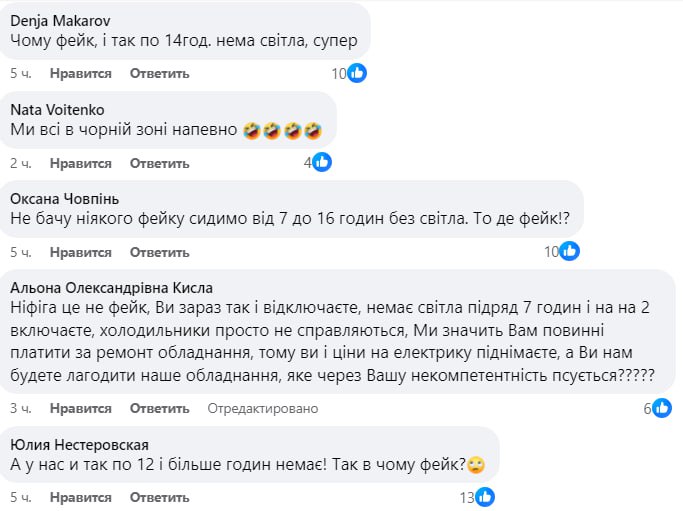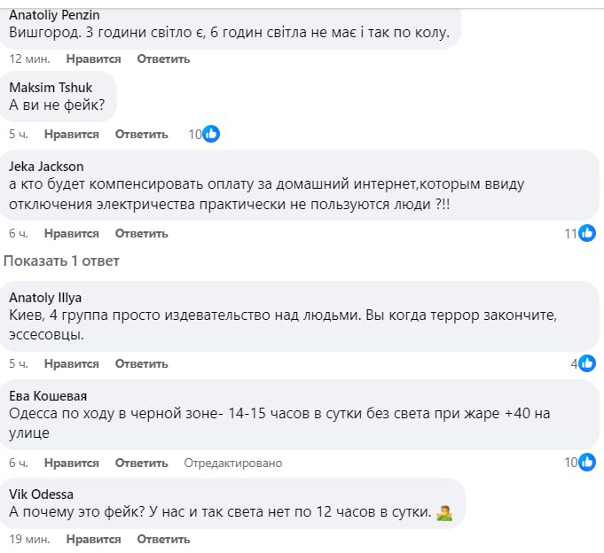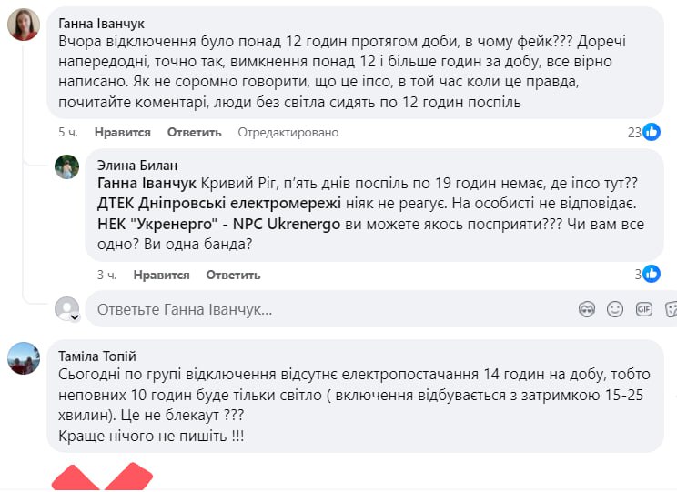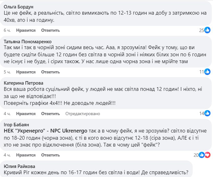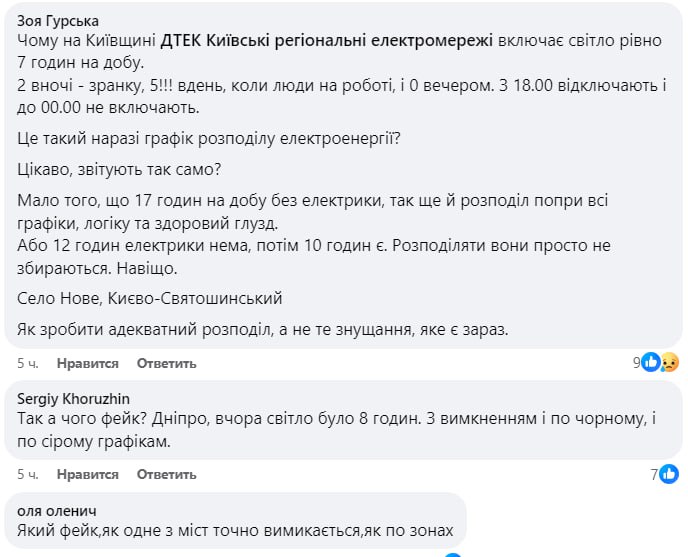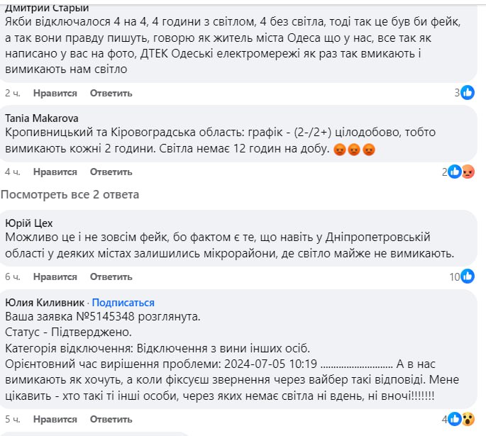Жители Киева и Киевской области, Кривого Рога, Днепра, Львова, Кировоградской области и Одессы заявляют о том, что у них уже около недели нет света по 12-19 часов в сутки, причем подряд. При этом в некоторых городах Днепропетровской области свет практически не отключают.