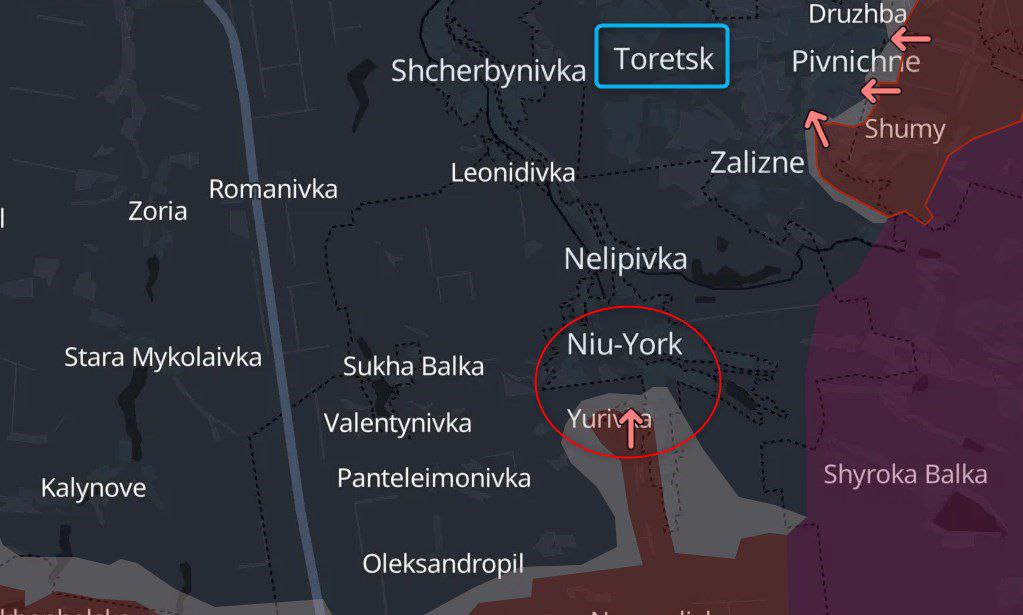 Что касается дальнейших действий на данном участке фронта, то, скорее всего, армия РФ попытается развить наступление на Нью-Йорк, полностью захватит этот поселок, после чего Торецк с пригородами окажется в фактическом полуокружности, так же как и части ВСУ, которые стоят на ещё старых линиях обороны около Горловки к западу от Нью-Йорка (их сейчас россияне, получается, обходят с запада и с севера).
