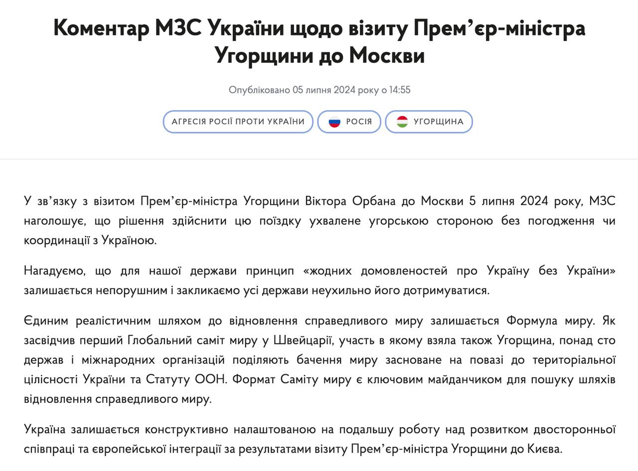 "Решение осуществить эту поездку принято венгерской стороной без согласования или координации с Украиной. Напоминаем, что для нашего государства принцип "никаких договоренностей об Украине без Украины" остается незыблемым, и призываем все государства неуклонно его придерживаться", - говорится в заявлении МИД.