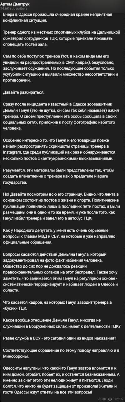 Народный депутат Артем Дмитрук потребовал у СБУ и МВД наказать активиста Демьяна Ганула, который вчера, как заявляет парламентарий, избил фитнес-тренера в Одессе.