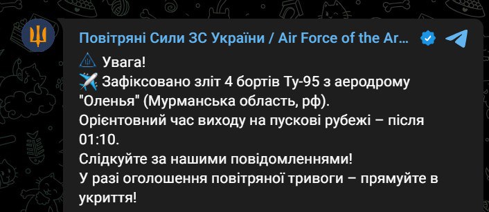 23:18 В Мурманской области России взлетели четыре стратегических бомбардировщика Ту-95. Если они будут пускать ракеты, то обстрел может начаться примерно после часа ночи, сообщают Воздушные силы ВСУ.
