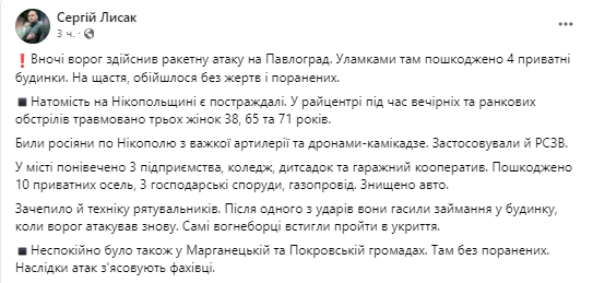 Также враг атаковал Марганецкую и Покровскую громады, там без пострадавших.