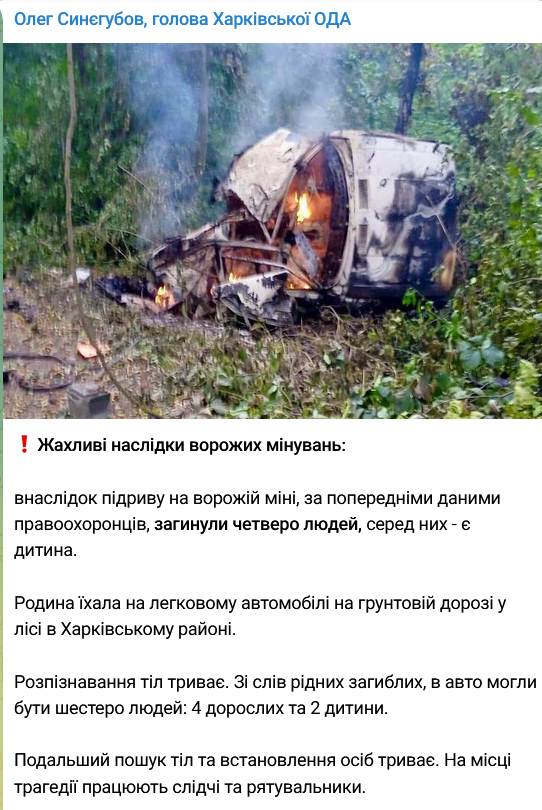 Заявляется, что семья ехала в легковом авто по грунтовой дороге в лесу в Харьковском районе. По словам родных погибших, в автомобиле могли быть шесть человек: четверо взрослых и два ребенка.