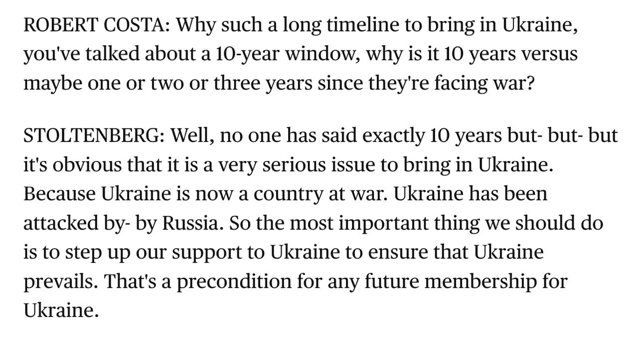 "Никто не сказал точно 10 лет, но очевидно, что это очень серьезный вопрос для Украины. Потому что Украина сейчас находится в состоянии войны", - сказал генсек НАТО.