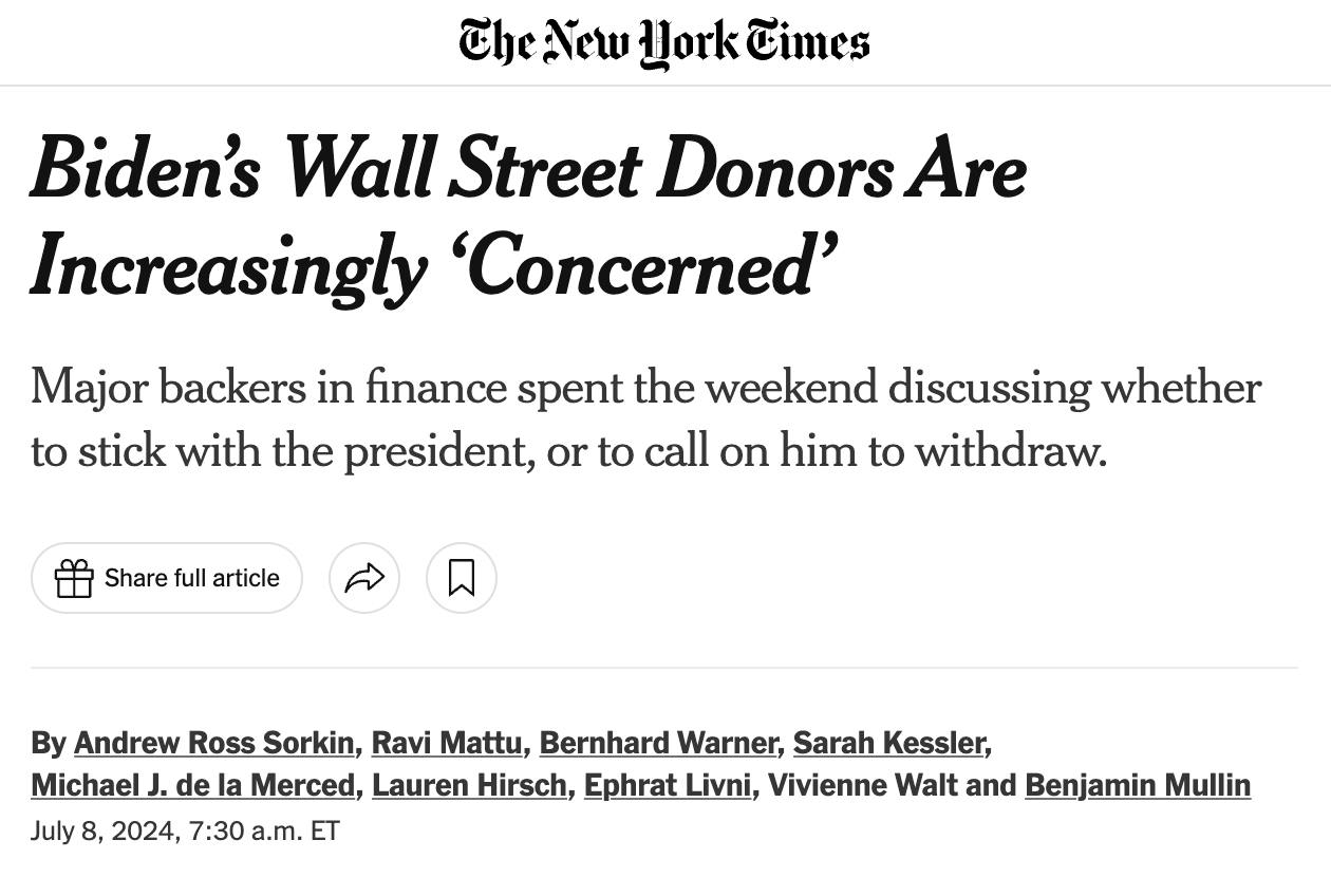 Один из спонсоров партии заявил, что уход Байдена в отставку "неизбежен", вопрос лишь во времени и способе реализации этого решения. Спонсоры рассматривают различные сценарии, как "элегантно" убрать Байдена, сохранив его репутацию.