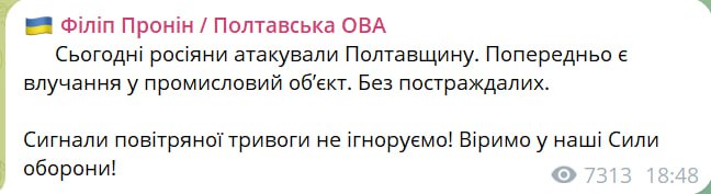18.56 Глава Полтавской ОВА Пронин подтвердил ракетный удар по региону.