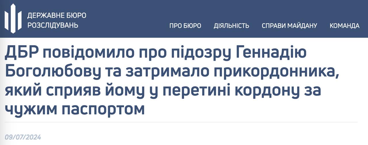 Сообщается, что бизнесмен выехал за границу в сопровождении своего близкого родственника 24 июня на поезде "Киев - Хелм", хотя по базам указано, что границу он не пересекал. Установлено, что Боголюбов выехал по недействительному паспорту гражданина Украины, физически находящегося в Украине и страну не покидавшего.