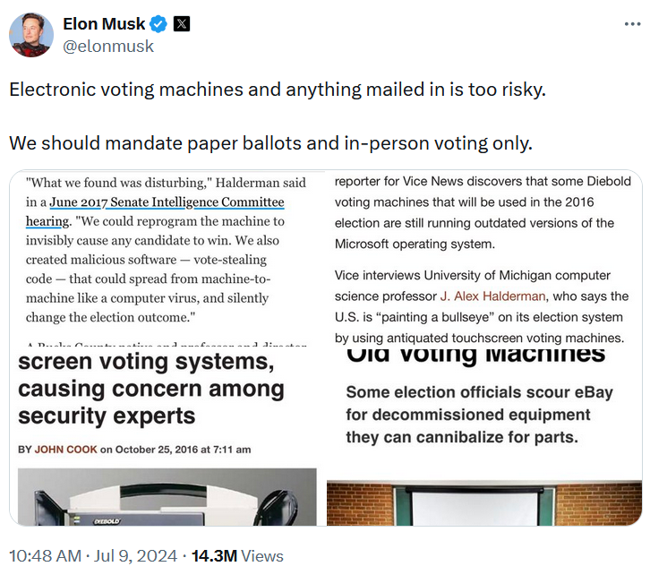 К посту Маск прикрепил несколько публикаций СМИ, где говорится о возможности изменить результаты выборов в случае использования электронных машин, а также применении в них устаревших версий Windows (например, 2003 года во время выборов 2016-го).