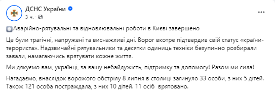 В Киеве завершили разбор завалов после обстрела 8 июля. В результате массированной ракетной атаки погибли 34 человека, в частности пятеро детей. Пострадал 121 человек, в том числе 10 детей. Известно, что 10 человек спасли.