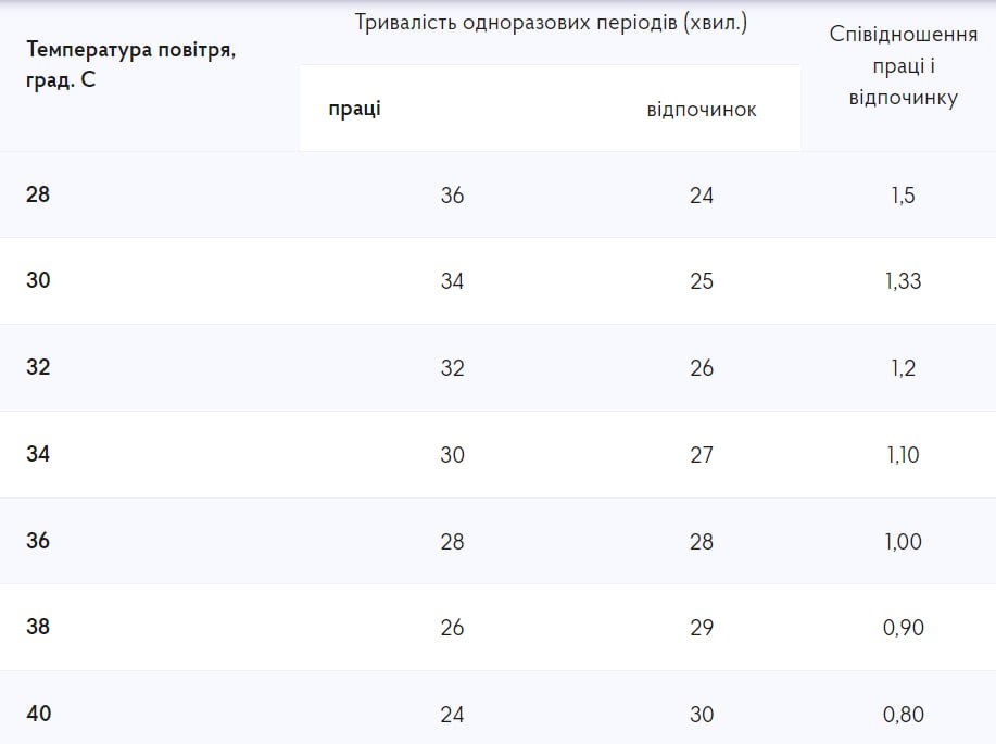 При температуре +28 градуса соотношение времени труда и отдыха должно составлять 1,5:1 (36 минут работы – 24 минуты отдыха), при +30 – 1,33:1 (34-25 минут) и т. д. до +40, при которых соотношение должно быть 0,8:1 (24:30 минут).