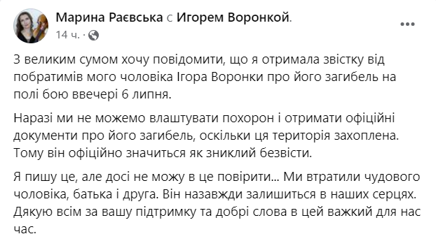 "С большой грустью хочу сообщить, что я получила известие от побратимов моего мужа Игоря Воронки о его гибели на поле боя вечером 6 июля. Я пишу это, но до сих пор не могу в это поверить... Мы потеряли прекрасного мужа, отца и друга. Он навсегда останется в наших сердцах", – написала Раевская.