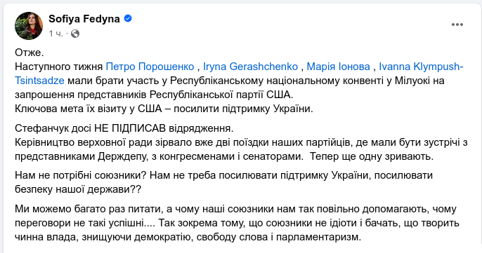 "Стефанчук до сих пор не подписал командировку. Руководство Верховной Рады сорвало уже две поездки наших партийцев, где должны были быть встречи с представителями Госдепа, с конгрессменами и сенаторами. Теперь ещё одну срывают. Нам не нужны союзники? Нам не нужно усиливать поддержку Украины, усиливать безопасность нашего государства?" – возмущается Федына.