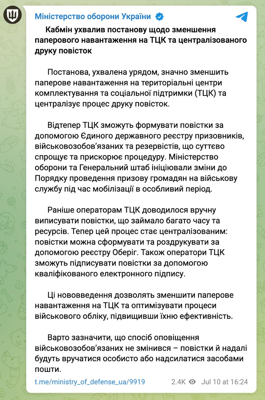 Как мы уже рассказывали, после 16 июля ТЦК запустят кампанию по рассылке повесток. Причем для ускорения этот процесс отдельным постановлением правительства "автоматизировали".