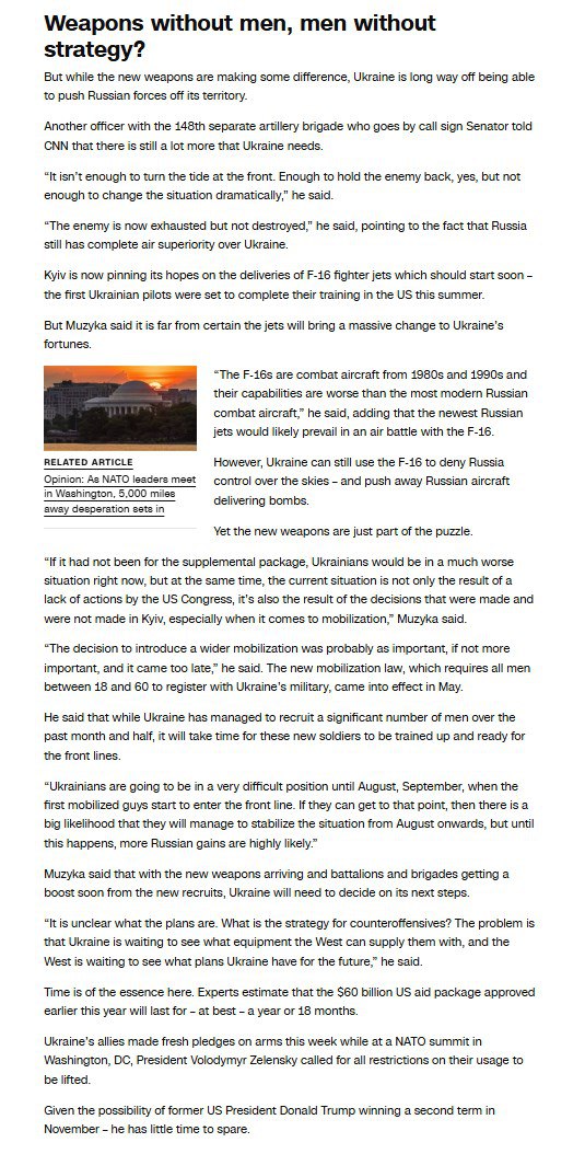 Он также считает, что нынешняя ситуация на фронте - это не только следствие задержек с помощью, но и "результат тех решений, которые принимались и не принимались в Киеве, - особенно когда речь идет о мобилизации".