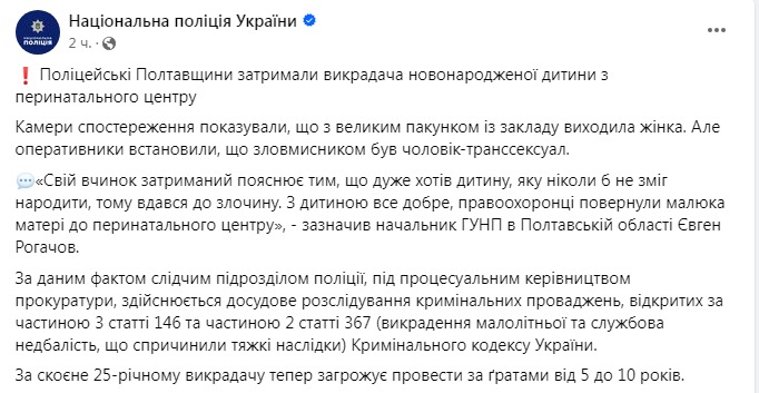 "Полицейские Полтавщины задержали похитителя новорожденного из перинатального центра. Камеры наблюдения показывали, что с большим свертком из заведения выходила женщина. Но оперативники установили, что злоумышленником был мужчина-транссексуал", - говорится в публикации правоохранителей.
