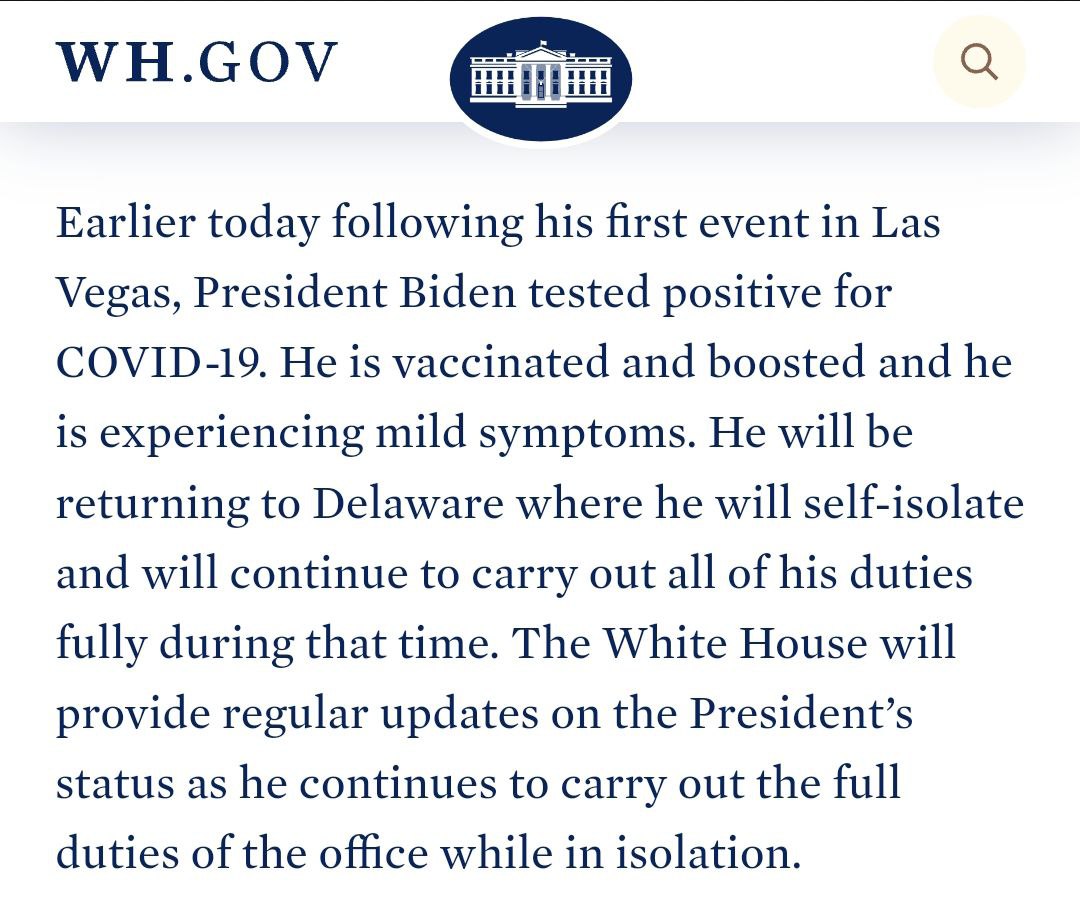 В госпитализации Байден не нуждается, но ушел на самоизоляцию и принимает антивирусные препараты.