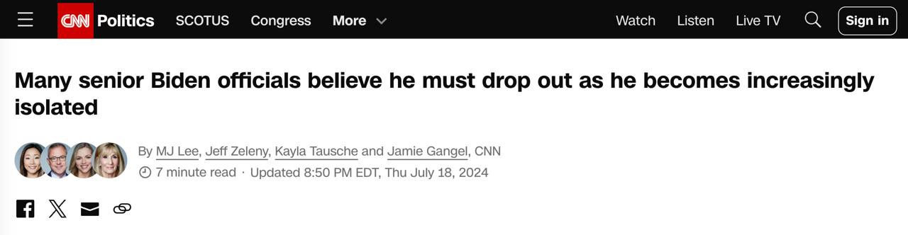 Сотрудники Белого дома и члены предвыборного штаба Байдена полагают, что ему лучше сняться с выборов, пишет CNN со ссылкой на источники.