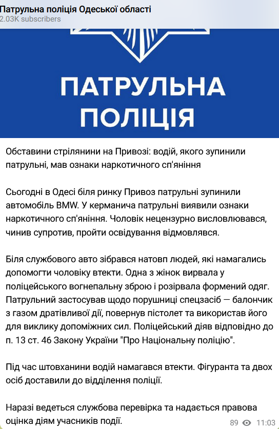 "Во время преследования патрульными полицейскими вероятного нарушителя правопорядка вблизи рынка "Привоз" произошел конфликт с участием прохожих: группа лиц пыталась помешать полицейским. В результате толкотни на патрульном разорвали форменную одежду. Соответственно патрульный полицейский произвел предупредительный выстрел в воздух", - говорится в сообщении полиции.