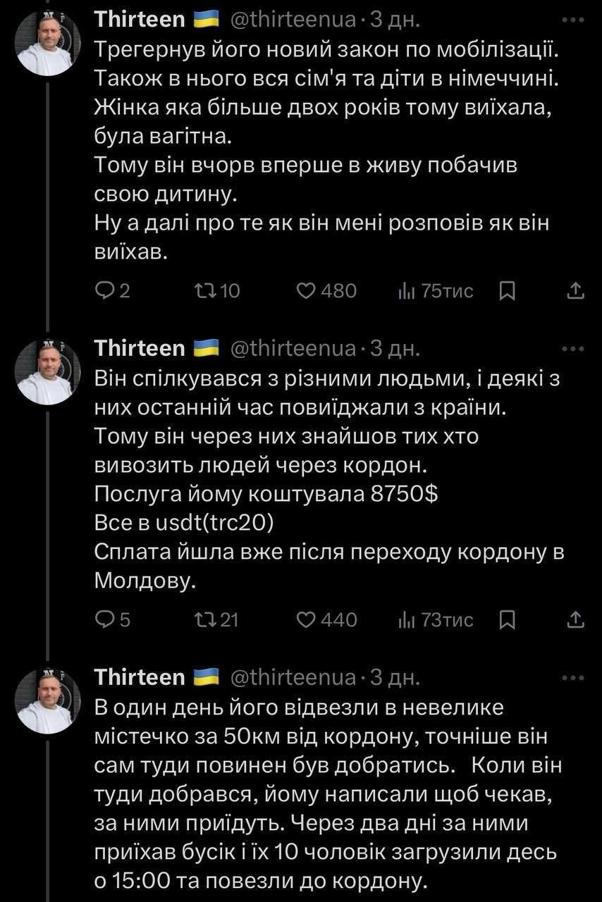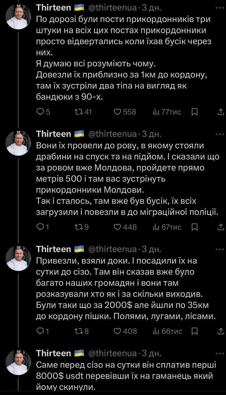 Привезли, взяли доки. И посадили их на сутки в СИЗО. Там он сказал уже было много наших граждан и они там рассказывали кто как и за сколько выходил. Были такие что за 2000$ но шли по 35км до границы пешком. Полями, лугами, лесами. Именно перед сизо на сутки он оплатил первые 8000$ usdt переведя их на кошелек который ему сбросили", - сообщает пользователь в Х.