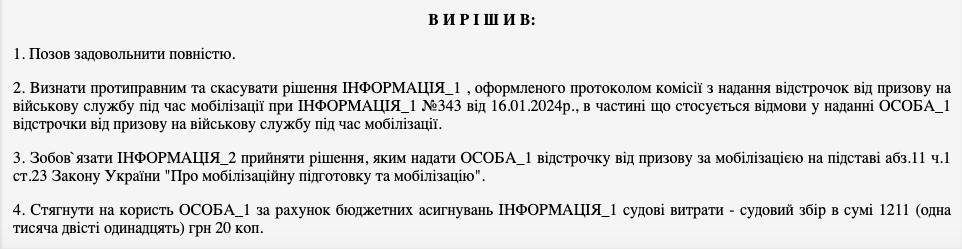 Суд вынес это решение по делу военнообязанного, который оспаривал отказ ТЦК в предоставлении отсрочки. У мужчины есть жена со ІІ группой инвалидности. Однако ТЦК не предоставил ему отсрочку, поскольку требовал документ из РАГСа, в котором указана информация о наличии или отсутствии других совершеннолетних трудоспособных родственников, которые могут осуществлять уход за женщиной с инвалидностью.