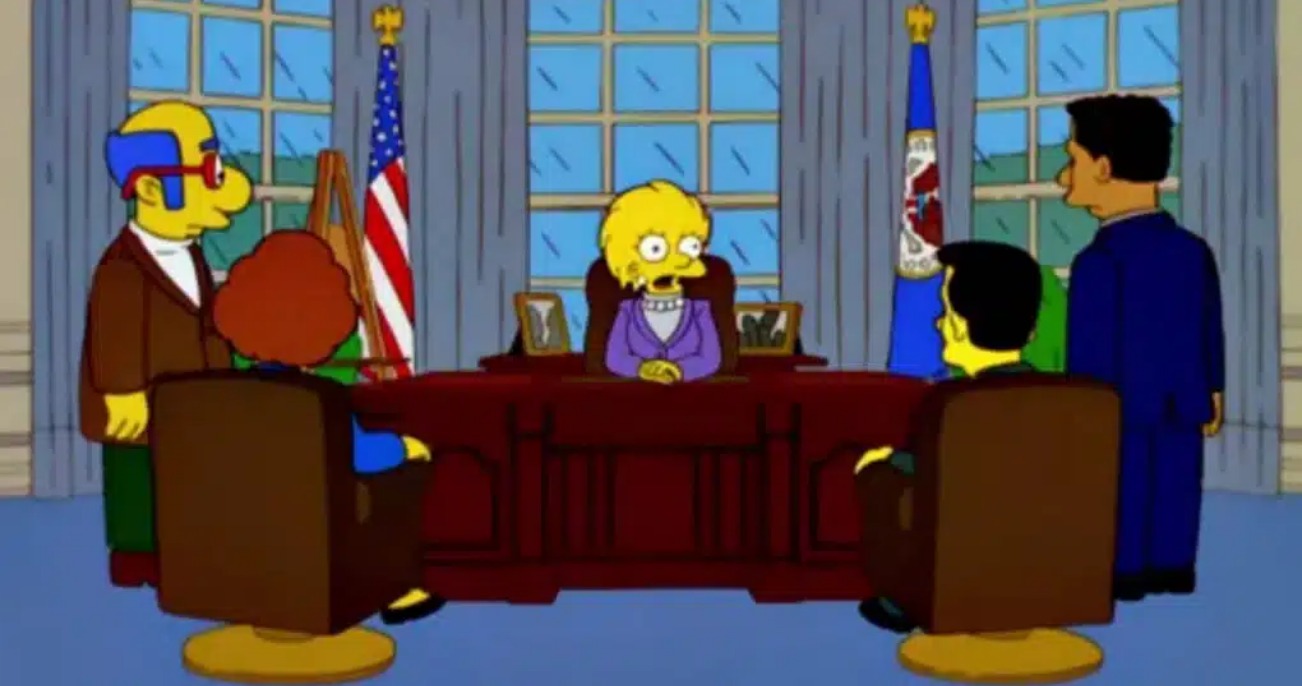 Так, в 17-й серии 11-го сезона "Симпсонов" под названием "Барт в будущее", который вышел в 2000 году, Лиза Симпсон становится президентом США. В кадре она сидит в кабинете в окружении помощников, при этом героиня сериала одета в фиолетовый костюм с белыми бусами.