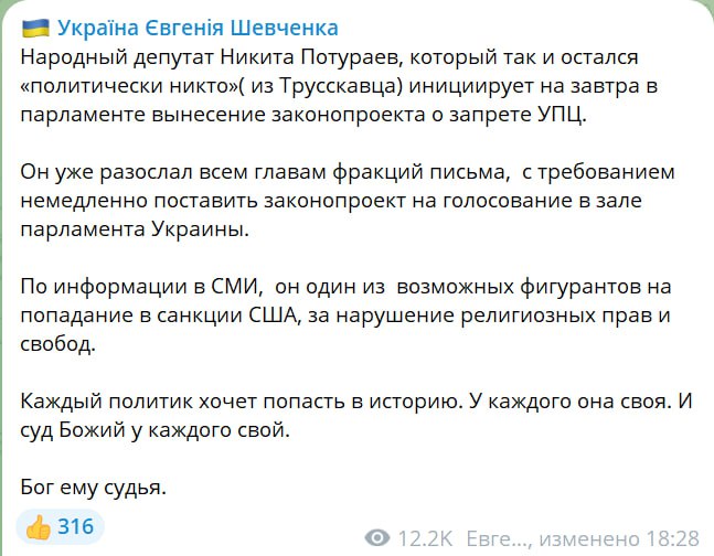 Народный депутат Никита Потураев инициирует на завтра, 23 июля, вынесение законопроекта о запрете Украинской православной церкви (УПЦ).