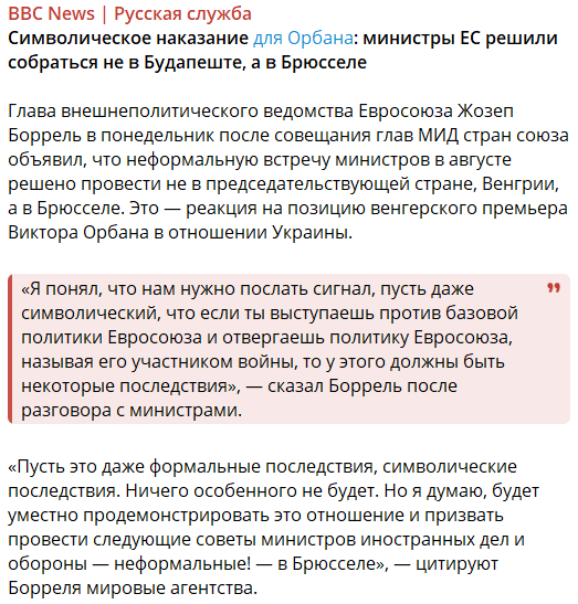 Глава внешнеполитического ведомства Евросоюза Жозеп Боррель в понедельник, 22 июля, после совещания глав МИД стран союза объявил, что неформальную встречу министров в августе решено провести не в председательствующей стране, Венгрии, а в Брюсселе. Это - реакция на позицию венгерского премьера Виктора Орбана в отношении Украины.
