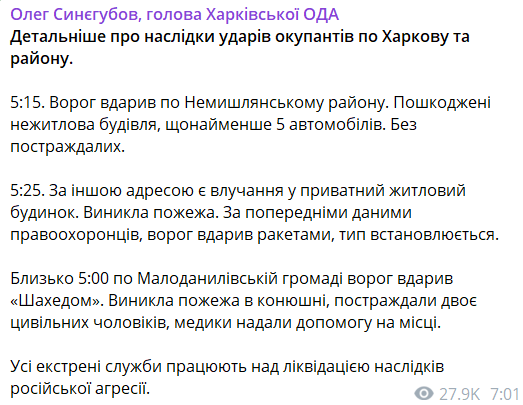 Первый прилёт был в Немышлянском районе, по промышленному объекту. Повреждено не менее пяти автомобилей.