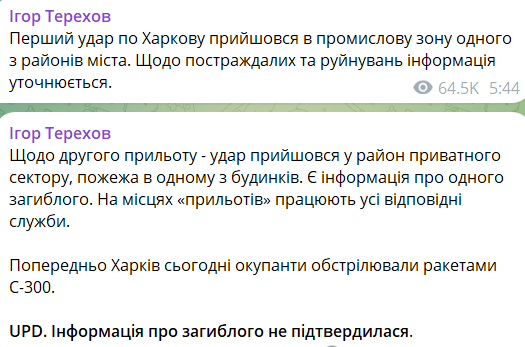 Об этом сообщили мэр города Игорь Терехов и глава Харьковской областной военной администрации Олег Синегубов в своих телеграм-каналах.