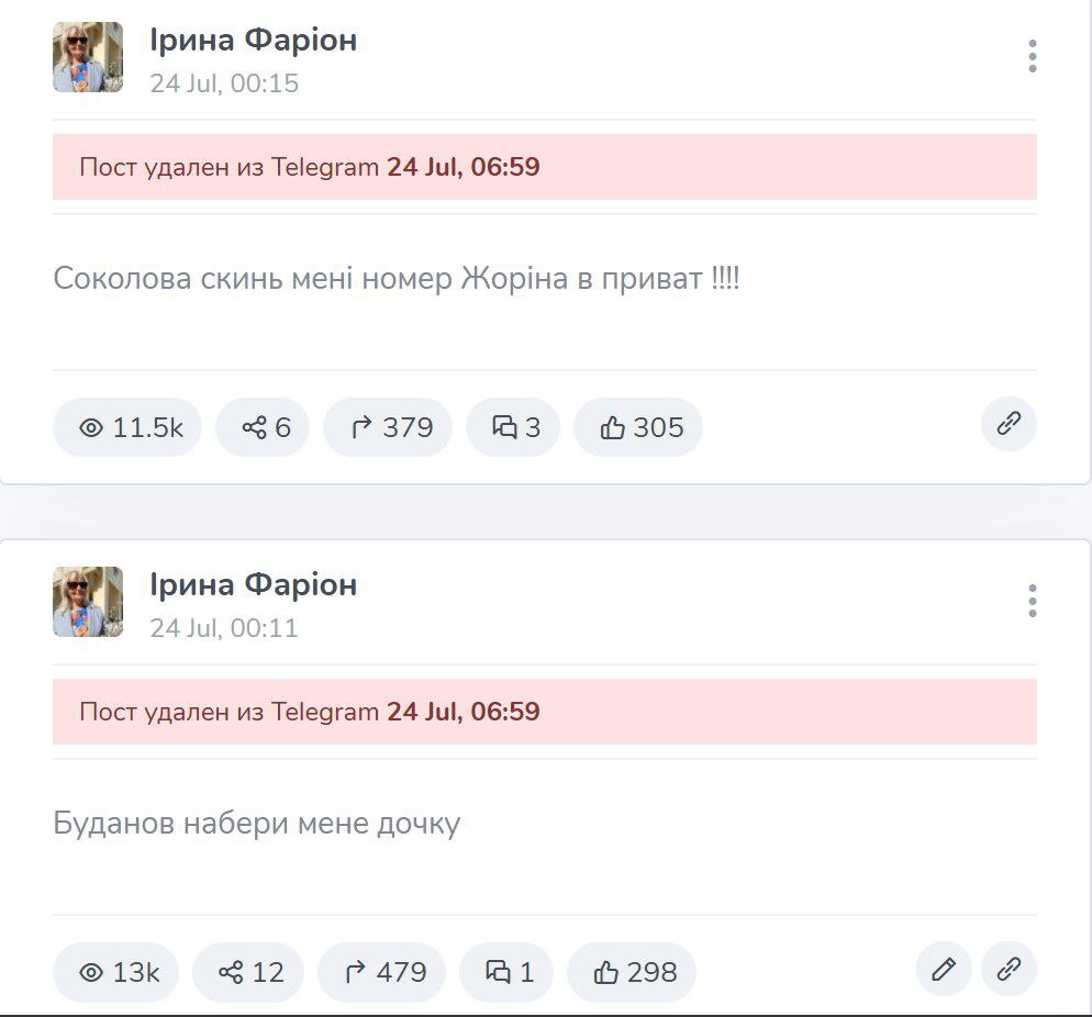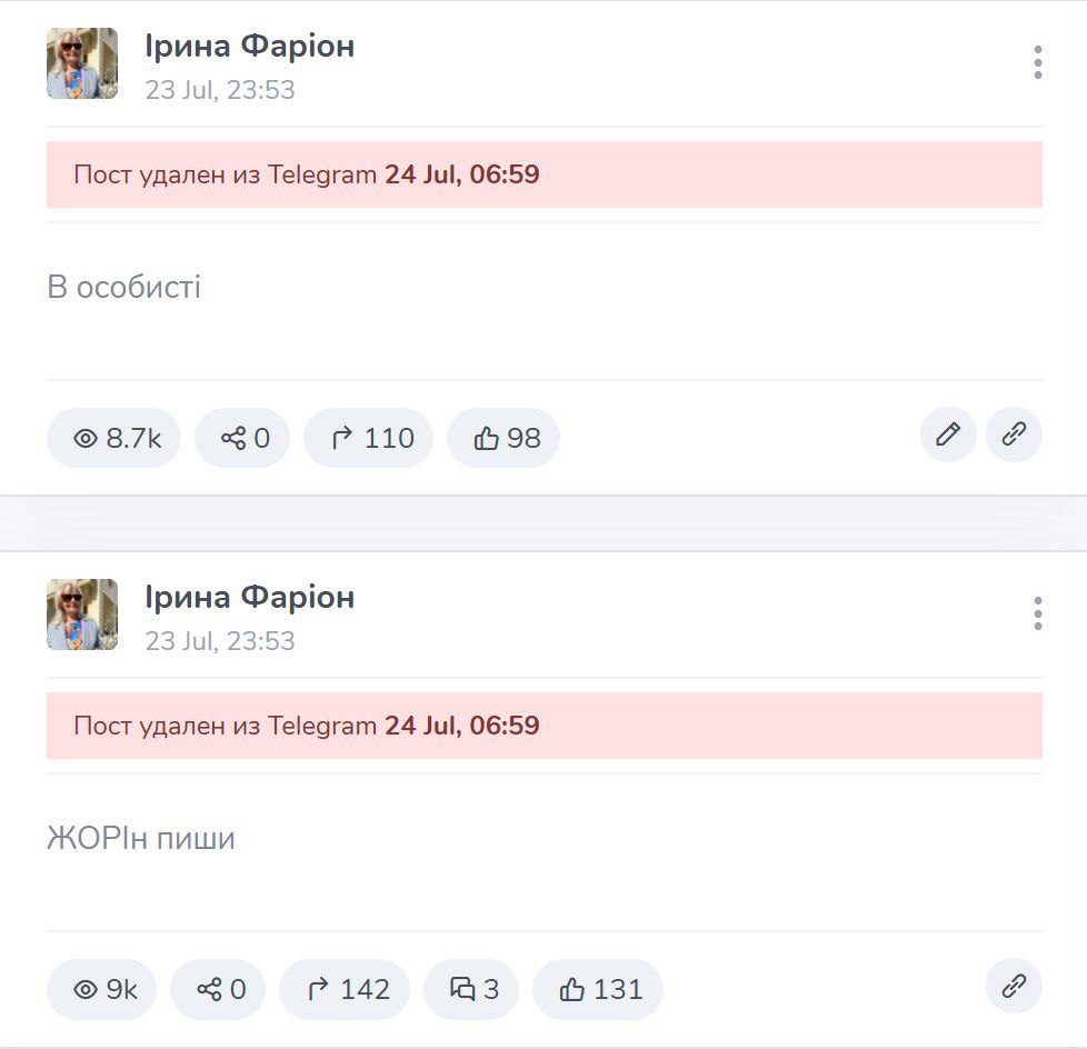 Сегодня ночью в телеграм-канале убитой во Львове Ирины Фарион появилось несколько странных сообщений, которые под утро были удалены.