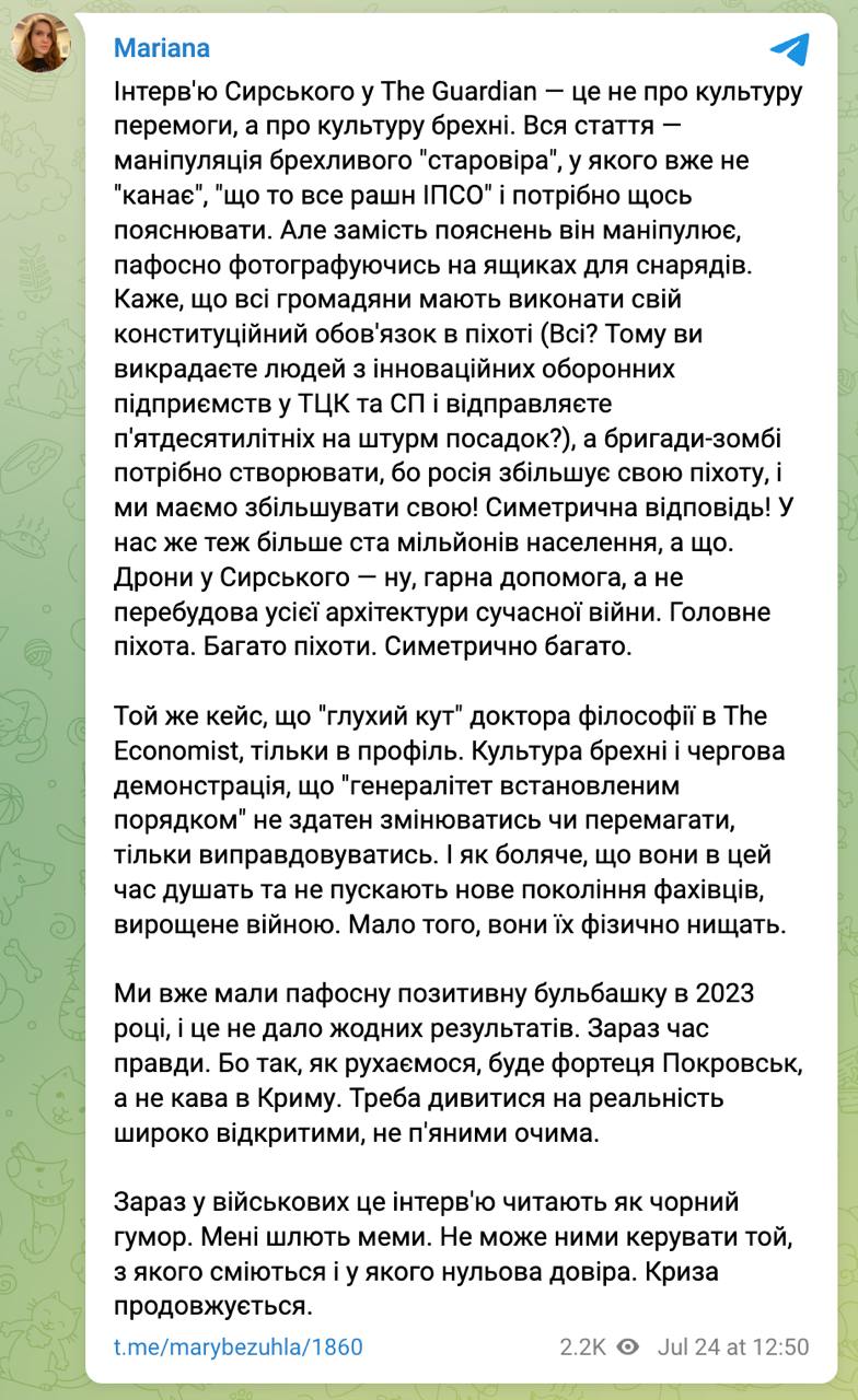 Народный депутат Марьяна Безуглая раскритиковала главнокомандующего ВСУ Александра Сырского за его интервью британской газете The Guardian.