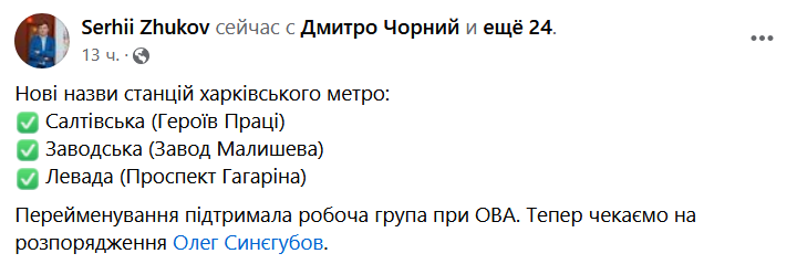По данным депутата, станцию ​​"Героев труда" хотят переименовать в "Салтовскую", "Завод имени Малышева" - в "Заводскую", станцию ​​"Проспект Гагарина" - в станцию ​​"Левада".